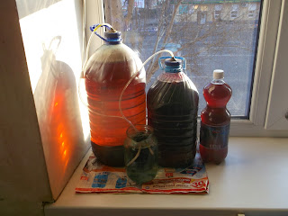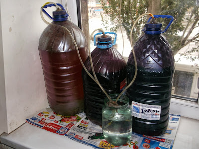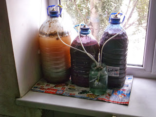 Всё начинается со сбора спелых плодов, - помнишь, как мы собирали виноград на своей даче? Так вот, собрали, привезли домой и не помыв ягоды (чтобы не смыть винные дрожжи), при помощи соковыжималки, получаем сок. Сок процеживаем и разливаем в ёмкости - в нашем случае это пластиковые паки из под воды. До верха не доливаем (смотри картинку) и оставляем на трое суток, пока сок хорошо забродит.